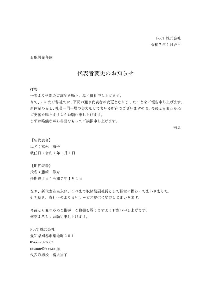 2025.01.01 代表取締役変更のお知らせ この度、弊社は令和6年12月31日の株主総会により代表取締役が交代いたしました。 新体制のもと、社員一丸となって社業の発展に努めてまいる所存でございますので、何卒倍旧のご指導ご支援を賜りますようお願い申し上げます。 旧代表取締役 藤﨑修介(退任) 新代表取締役 富永裕子(就任)